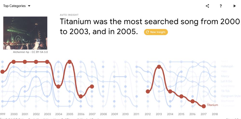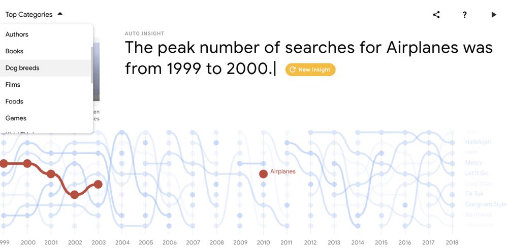 在歷史熱門話題搜尋網頁中,我們可以看到一張密密麻麻的曲線圖,其中就是從 1999 年到 2018 年之間熱門話題的曲線圖,想要知道進一步的資訊,只要點選上方的「New Insight」便會出現另一段曲線的故事。