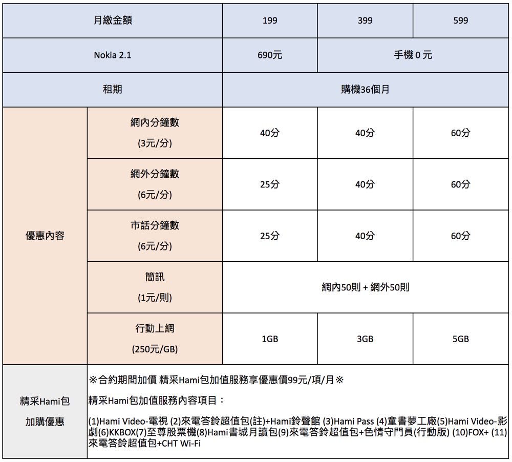 Nokia2.1 共有藍、灰兩色,定價 NT$3,990元。全台中華電信門市、神腦特約門市與神腦線上商城、經銷商、連鎖賣場與各大電商平台同步開賣,搭配中華電信「升4G 0元購機方案」,只要月付 399元,搭配 36 個月租期,就可享有手機 0 元帶回家!此外還可以同享較原 3G 資費約 4 倍價值的超值優惠,包含 3GB 免費上網量、網內/外各 50 則簡訊、以及網內、網外、市話各 40 分鐘,輕鬆體驗 4G 行動上網樂趣。