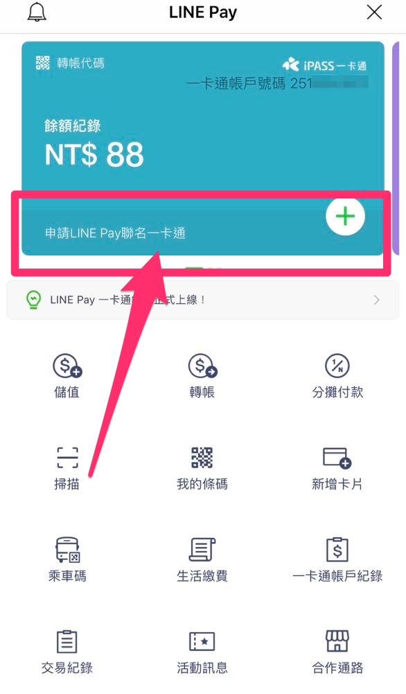 基本上只要回到 LINE Pay 主頁面就能發現畫面上方已經出現自己的一卡通帳號和註冊成功的 88 元,而下面有一行小小的「申請 LINE Pay 聯名一卡通」,才是這次的重點!