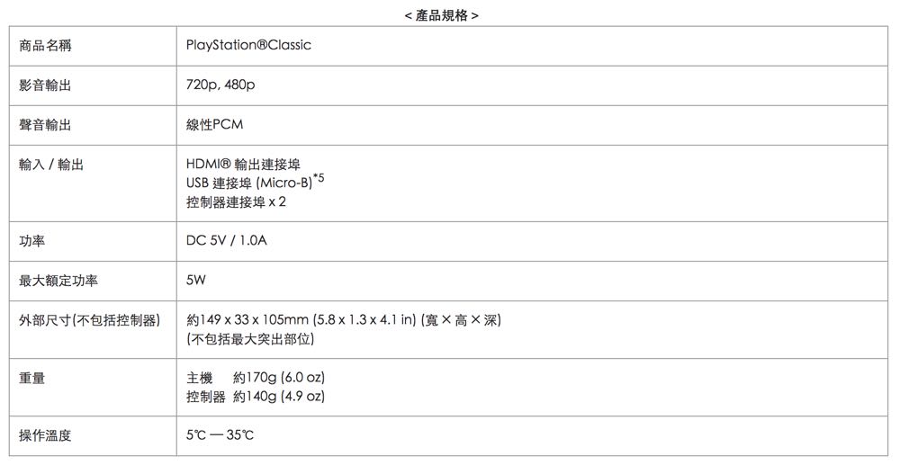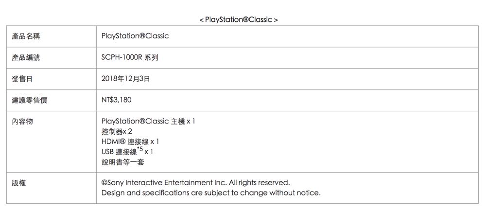 初代 PlayStation 自從於 1994 年 12 月 3 日在日本首次亮相,採用即時 3DCG 渲染技術並搭載 CD-ROM 等當時劃時代的創新技術推出後,對 90 年代及之後的遊戲產業開始產生了巨大影響。此次 PlayStation Classic 的外觀設計復刻 PlayStation,包括了按鈕配置,以及控制器和外包裝,但以縮小尺寸呈現,其側身較原版主機小 45%,體積小 80%。內建的 20 款 PlayStation 遊戲則是包括有《FinalFantasy VII》(SQUARE ENIX Co.,LTD.)、《Jumping Flash!》 (SIE)、《R4 RIDGE RACER TYPE 4》、《Tekken 3》(BANDAI NAMCO Entertainment Inc.)、《Wild Arms》(SIE)等等。PlayStation 表示 PlayStation Classic 適合所有人,包括目前的 PlayStation 粉絲與喜歡遊玩 PlayStation 的懷舊粉絲,以及想要體驗 90 年代經典 PlayStation 遊戲的 PlayStation 新玩家。