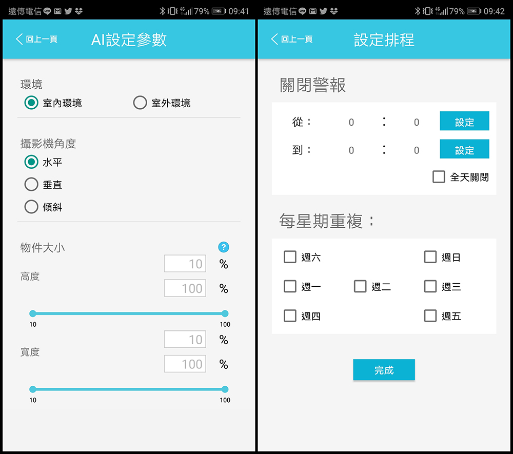 我們還可以設定影像偵測的參數包括室內、室外、攝影機角度以及物件大小,更可以針對上下班時間做個警報的時間排程,有夠貼心的。