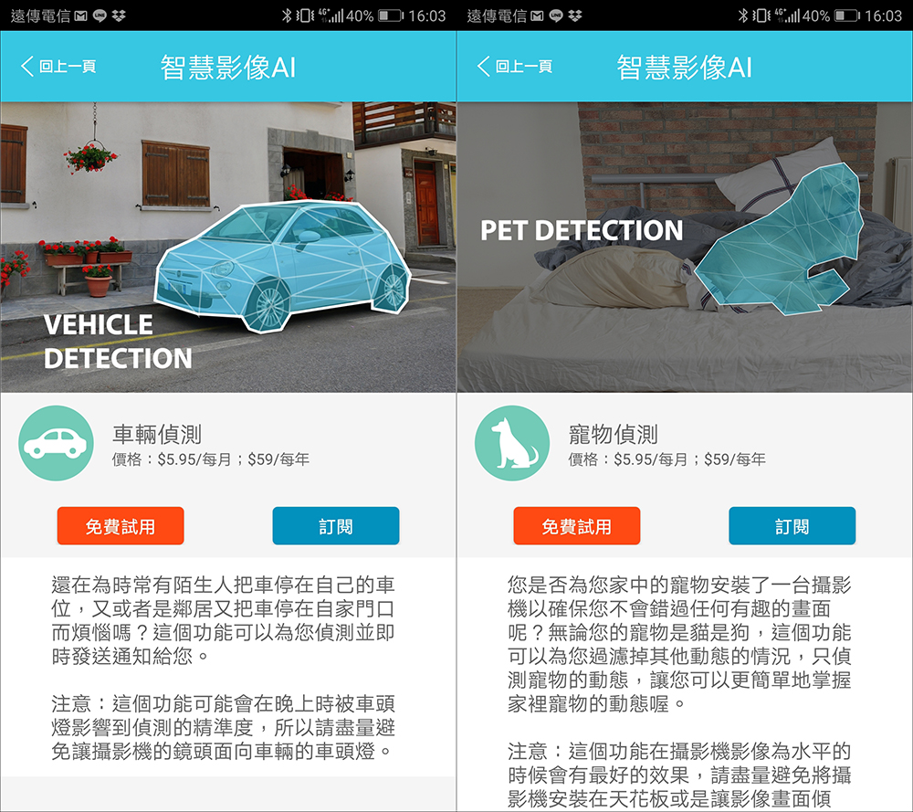 在寫 SpotCam 的 AI 智慧影像服務之前,就我認知這樣類似的影像辨識監控系統常應用在高端商用或工業用市場上,而且攝影機的服務授權價格非常貴啊!通常會搞到甚至幾百塊美金,但像我用了好久的 SpotCam 是透過無線 Wi-Fi 的方式,藉由雲端系統和行動 APP 的優勢,讓使用者能夠透過每個月訂閱的方式,用超便宜的價格就能使用這類的 AI 功能,以家用監控系統來說這真的是佛心來的啊!