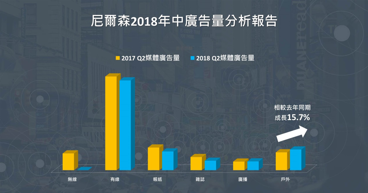 根據尼爾森2018年中廣告量分析,2018 Q2隨著年改政策實施、物價持續上漲,消費者信心不足,全媒體廣告預算皆受影響,與2017年同期相較,廣告投放形式趨向往戶外媒體流動,此趨勢也說明廣告主在選擇媒體時,普遍認為戶外廣告結合各場域,任何角落都不放過,大大增加品牌能見度、提高指名度,引起各產業蠢蠢欲動,搶攻黃金版位。