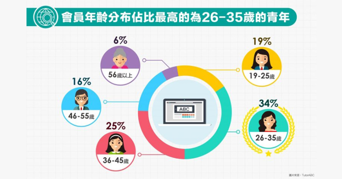 圖為「TutorABC 2017線上英語年度學習觀察報告」會員年齡分布