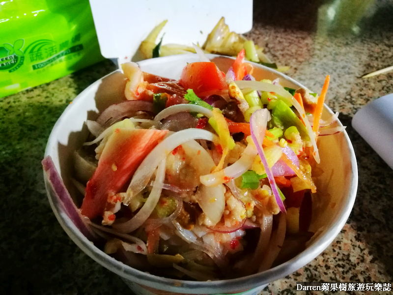 老闆是泰國人在夜市提供平價又好吃的泰國涼拌菜,滿滿的綜合涼拌海鮮加上店家獨家醬汁新鮮好吃。