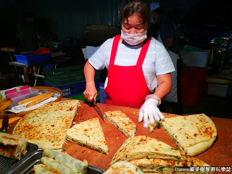 哈爾濱千層大蔥餅看著老闆娘喀滋切開,酥脆外皮夾著Q軟千層,搭配新鮮蔥末,越嚼越有麵香味。