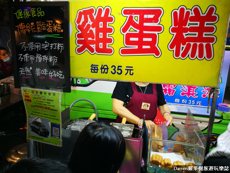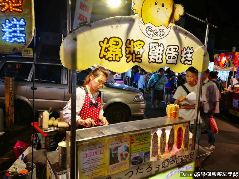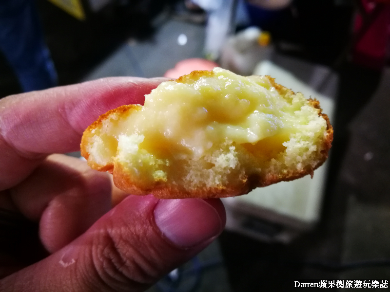攤位前貼著爆漿雞蛋糕有3種吃法,熱著吃、冰著吃、冷著吃都很不錯,蛋糕口感走綿Q路線小心會爆漿。