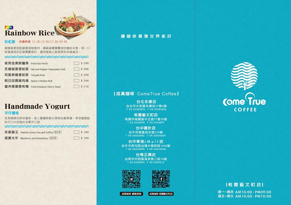 桃園成真咖啡菜單(taoyuan come true coffee menu),舒芙蕾鬆餅是店內招牌,也有創意薄餅(薄片披薩)