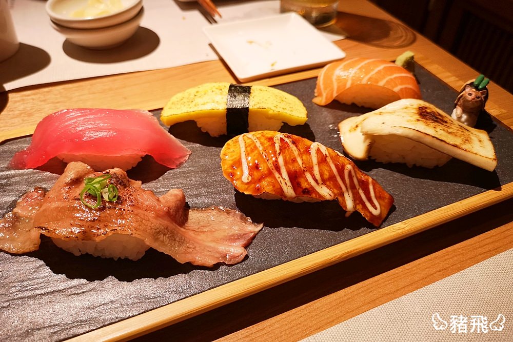 綜合6貫套餐$168元,從上到下分別是鮪魚、玉子燒、鮭魚、炙燒牛肉、炙燒鮭魚、杏鮑菇。