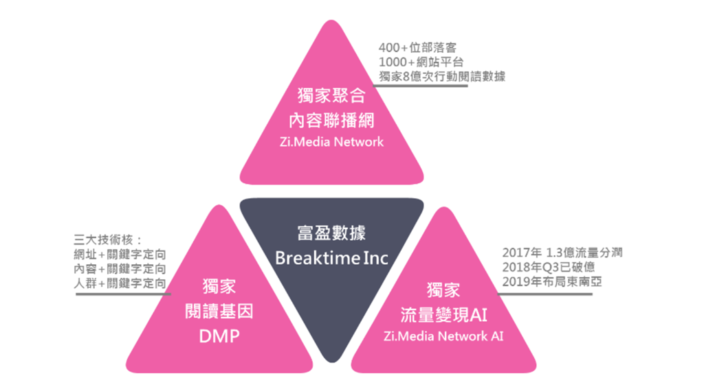 鴻海集團投資之數據科技公司富盈數據 Breaktime inc. 字媒體計畫 成立將滿一年,首次公開亮眼的成績單。2017年「Zi.Media Network字媒體內容聯播網」已為內容創作者實現1.3億元以上的流量收入,2018年至今已突破此金額,並且持續擴大中。Zi.Media Network 至今有 1000 個網站主、400 多位部落客、內容創作者加入,掌握台灣8億8千6百萬次的行動閱讀瀏覽量,以「用戶 X 內容 X 行為定向」三大維度,打造獨家「閱讀基因 DMP」與「Zi.Power Ads AI 字媒體最佳化廣告AI」,驅動內容聯播網的流量變現效能,協助內容平台與發佈商共創最佳收益!