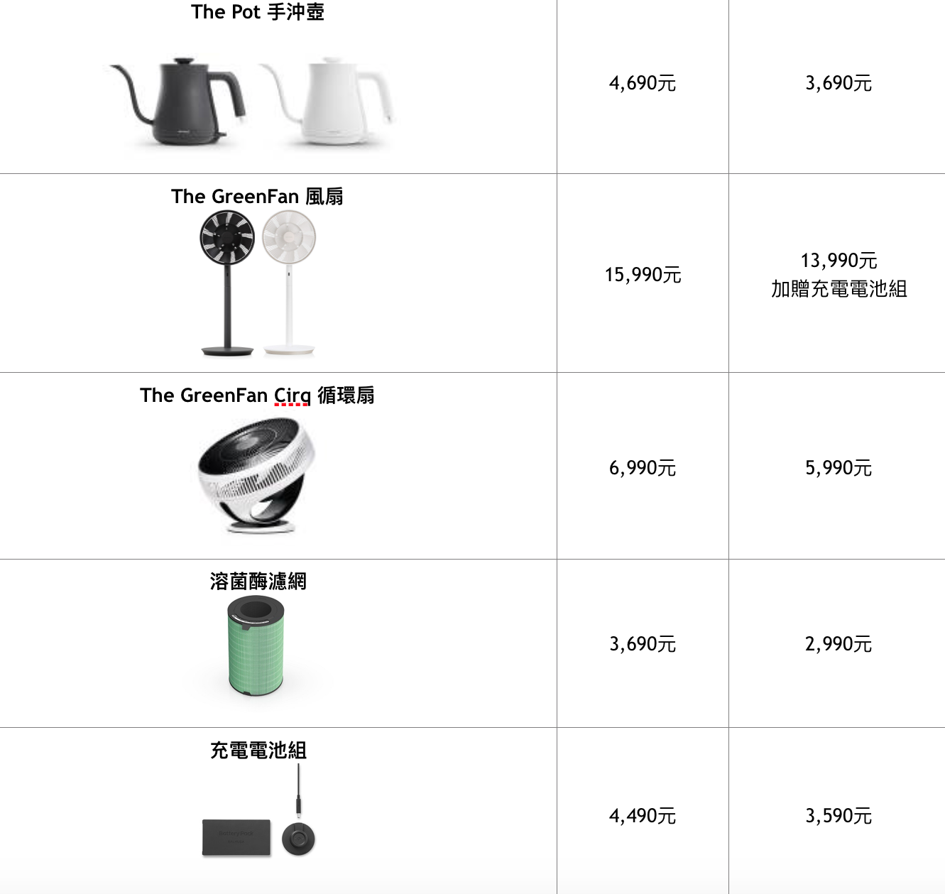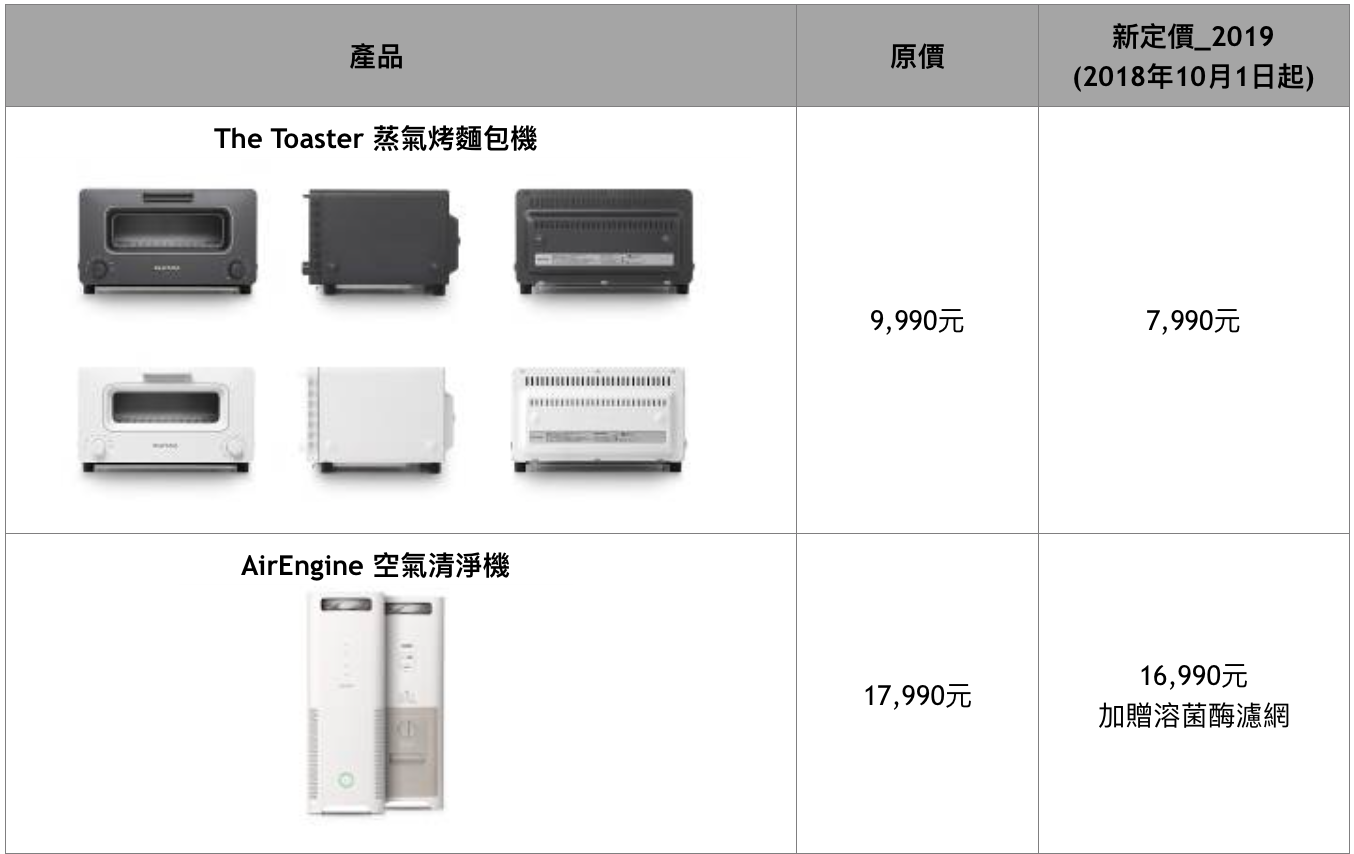 BALMUDA在台上市的全系列產品包含了在日本發售首年即熱銷十萬台的The Toaster 蒸氣烤麵包機,以及AirEngine空氣清淨機The Pot 絕美手沖壺The GreenFan風扇The GreenFan Cirq 循環扇等熱銷品項。為回饋廣大消費者的熱情支持,全新推出的「新定價_2019」將讓消費者更無負擔的擁有簡約、純粹而現代的美好生活體驗。自2018101日起BALMUDA官網推出「新定價_2019」活動,全系列產品均提供優惠價格: