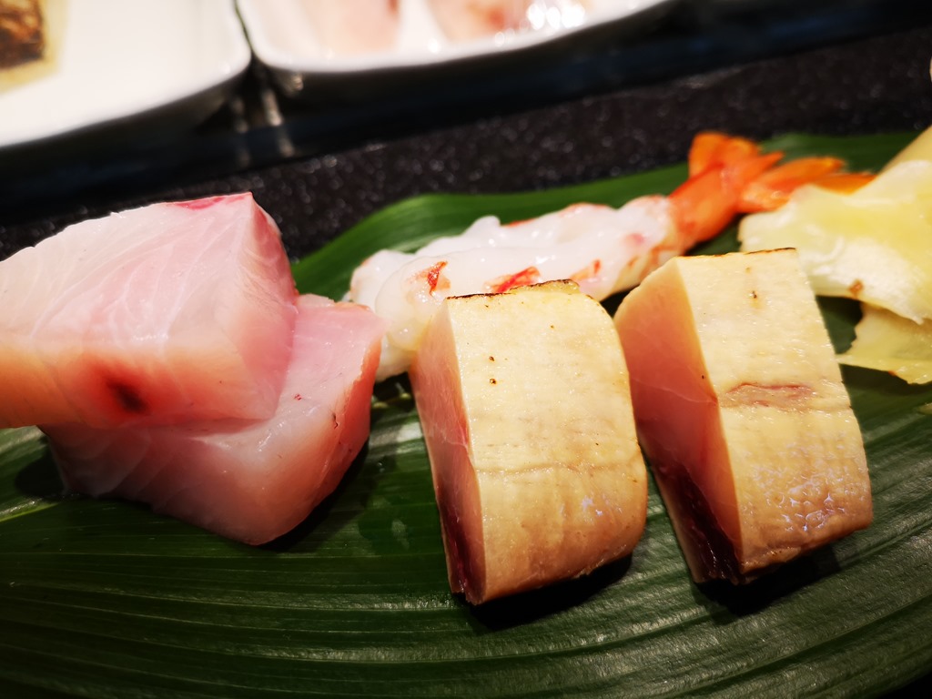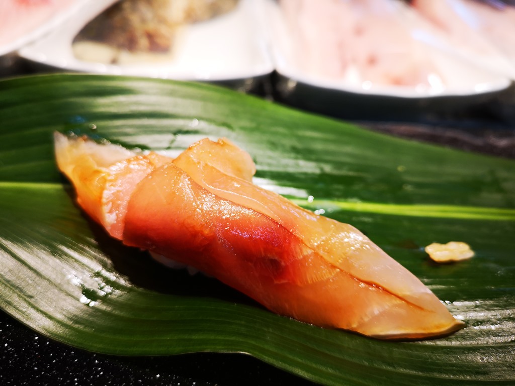 因為我用筷子技術非常爛,在享用這份旗魚握壽司時不小心掉入醬油碟中,以至於對這份一點印象都沒有,可惡。後來師傅跟我說,其實直接用手拿就可以,所以立刻就把手再次洗乾淨後直接用手了!