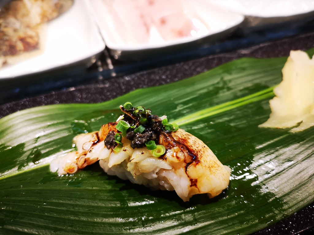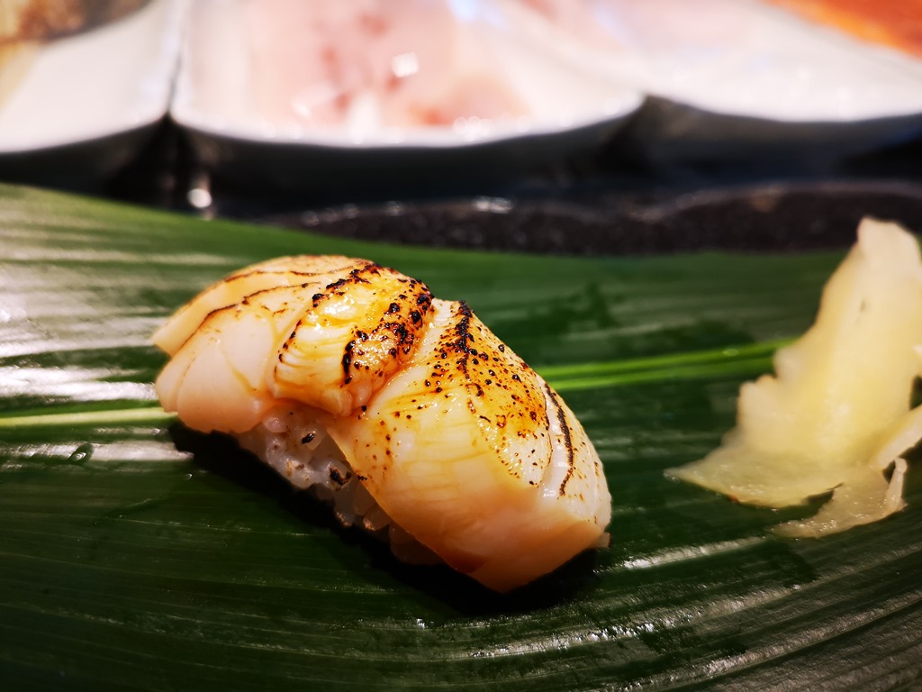 接著握壽司要登場了,第一道炙燒干貝握壽司也是讓我非常難忘,火焰炙燒過後的干貝有著更濃的香氣,也更凸顯甜味,入口就好像極為濃縮的海味迸發一樣,這道一定要列入下次必吃菜單中。