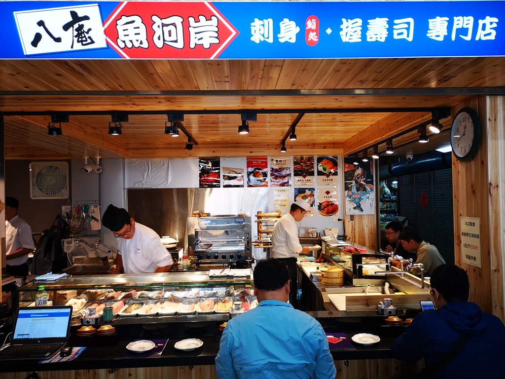 新竹東門市場除了早市賣菜外,這兩年重整後慢慢有些文青與高質感的美食小餐廳進駐,像是小東門蒸烤飯食、享初食堂…都是非常好吃又有質感的店家。這次造訪的店家是 八庵魚河岸 刺身握壽司專門店,它們在九月底時,正式入住新竹東門市場,對於喜愛生魚片與握壽司的我,是非常大的福音。原本以為上班日中午時間前往人會比較少,但吧台上幾乎沒有空位,只剩下立吞的位置,生意非常好。