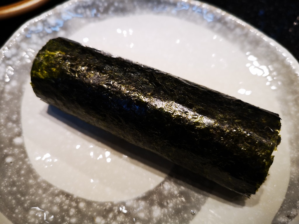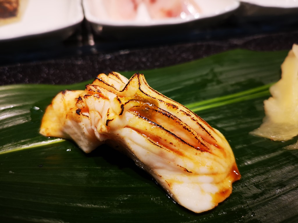 這道上來時原本以為是貝類的握壽司,但他居然是鱈魚,白肉魚炙燒後的香氣與鮭魚完全是兩個方向的,這味道相較於上一道要來的清淡,但更為優雅一些。照理說這道可以排在炙燒鮭魚之前會更好,但後來才發現他是為了最後一貫在鋪底。