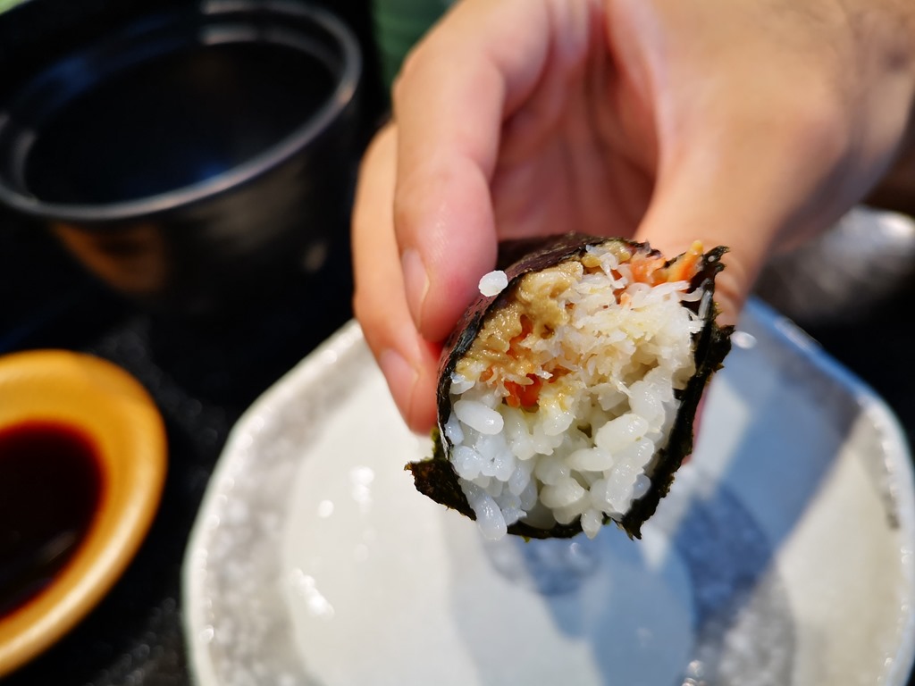 師傅配的菜色不一定會在菜單上出現,第一道來的手捲就是這樣,以鱈場蟹腳搭配味增與醋飯,先讓飢餓的我墊墊肚子。對了,要在吃壽司前後暖胃的朋友,熱湯與熱茶都可以自行取用,不用另外點。