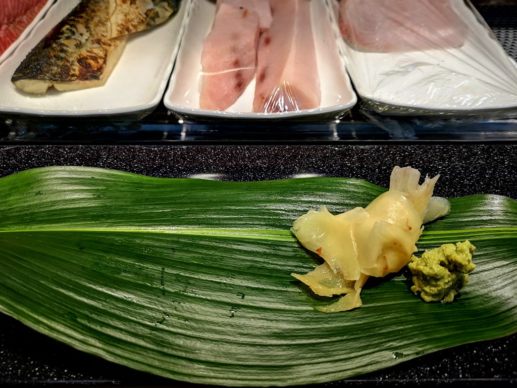 師傅開始準備料理前,會先在桌前擺放一片竹葉作為盛盤,還有一些醃嫩薑與山葵,當師父完成料理時,就會直接置放在這竹葉盤上。