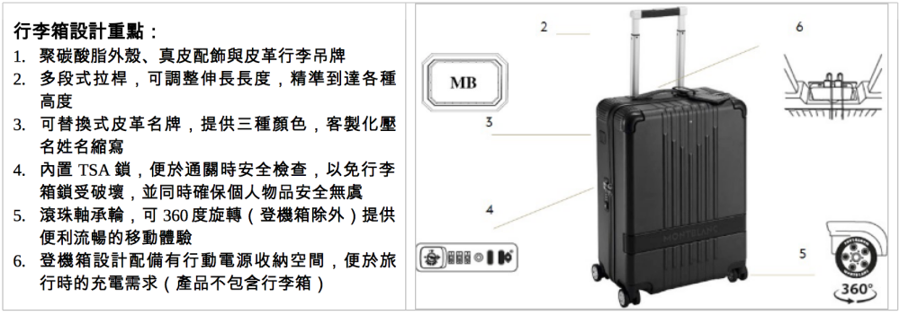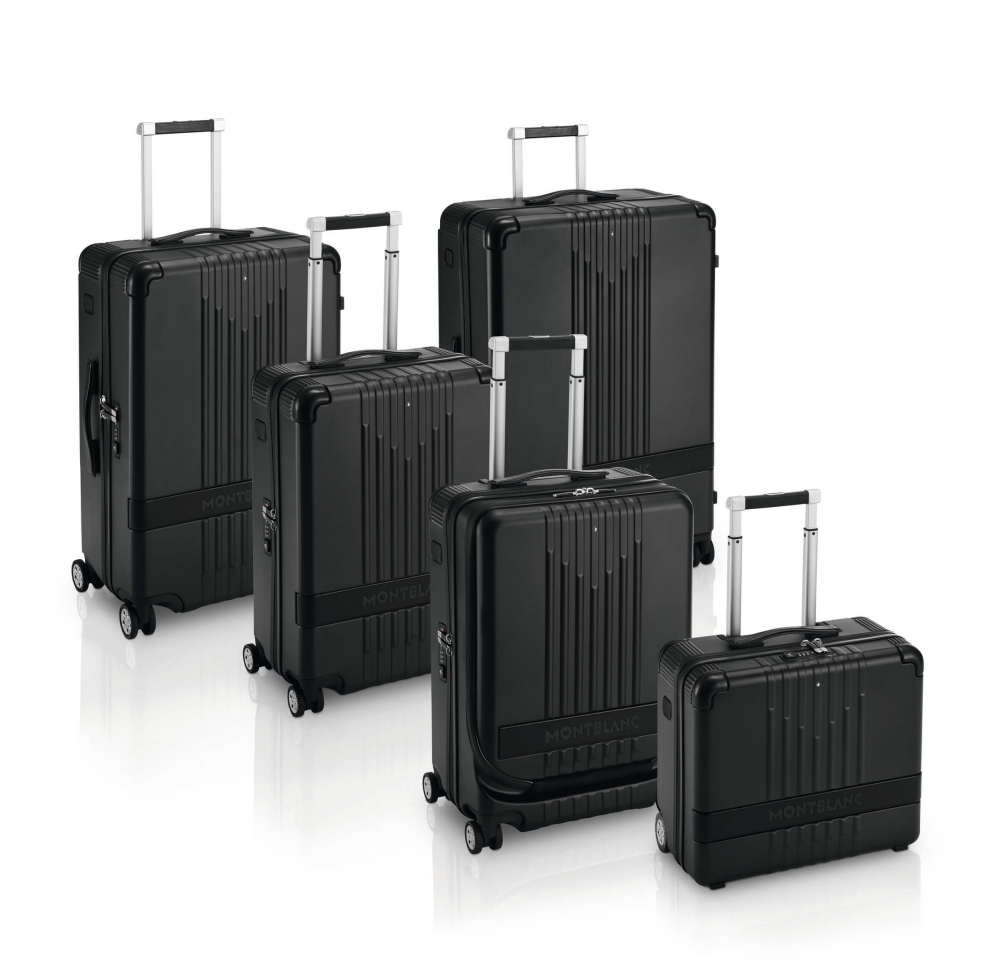 新款拉桿式行李箱於義大利製作,兼具義大利技術、德國機械力學以及日本高性能科技,使用輕盈的聚碳酸酯材質和優雅的皮革邊條設計,散發酷炫的時尚品味。日本製滾輪採滾珠軸承設計,可以360度旋轉,確保行李箱滑動時的絕佳順暢感與舒適感,而德國的多段式手把結構能夠精確地調整手把的高度。此外,箱體前板的原創溝槽紋設計(grooving)令人聯想到萬寶龍特有的「M」標誌,而側邊的皮革插入件可添加顧客的姓名縮寫,使行李箱更具個人化特色。