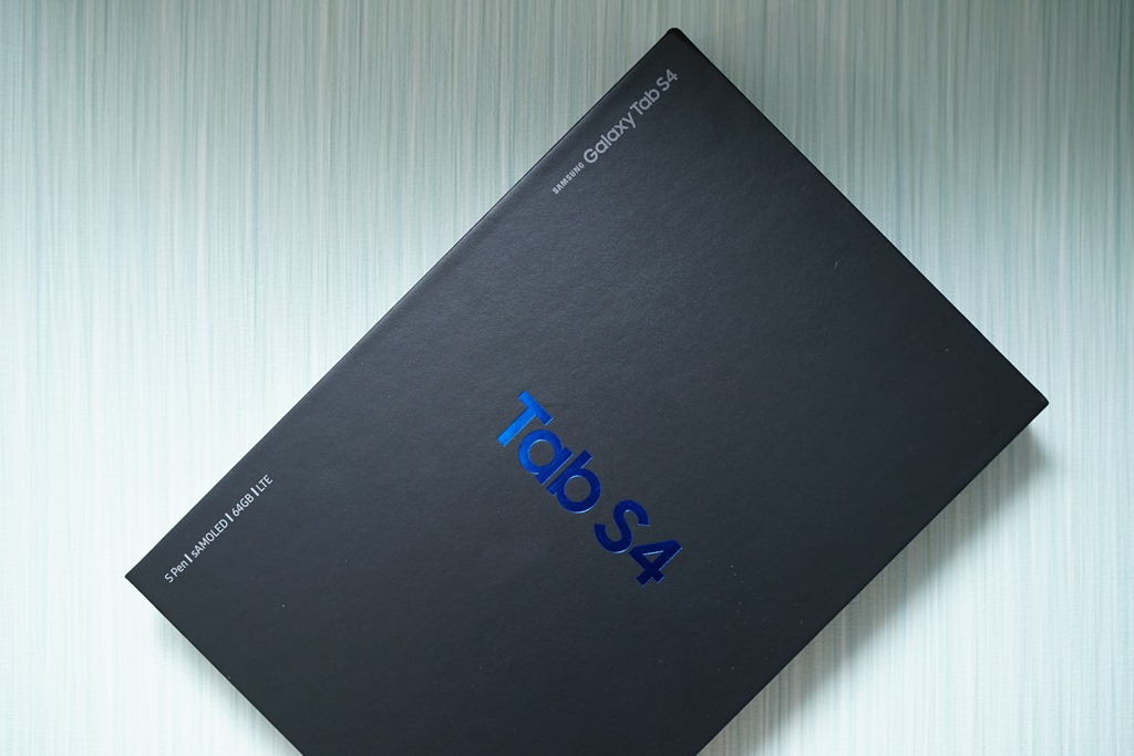 Samsung Galaxy Tab S4 延續 Galaxy 高階手機的包裝風格,全黑的盒裝上有著藍色燙金的 Tab S4 字樣。