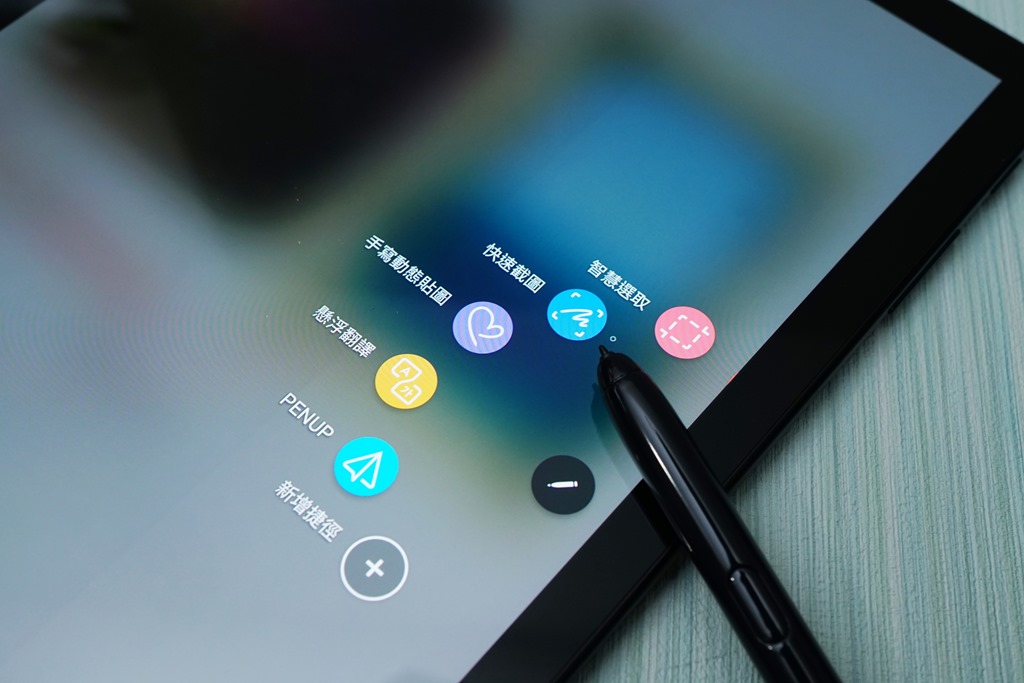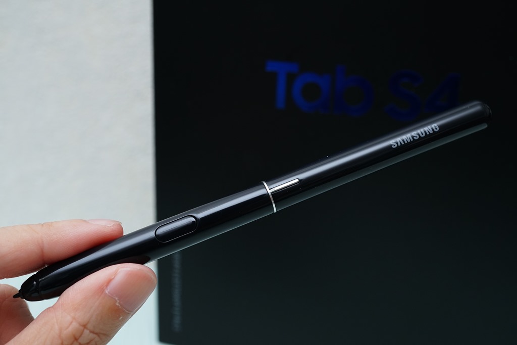 Galaxy Note 系列有強大的 S Pen,Samsung 也將這實用的書寫工具加進 Galaxy Tab S4 的支援行列中,開箱就可以看到黑色的 S Pen,圓形的筆身握起來手感和平常握原子筆的感覺差不多,寫起來也比較不費力。細緻的筆尖可以模擬出多種真實的筆觸效果,像是鋼筆、鉛筆、麥克筆、或是水彩筆、毛筆這類的創作工具,也具備 4096 階的高感壓,因此使用者可以透過下筆的輕重來改變筆跡,繪畫時也可以改變力道來創造出不同的筆觸。