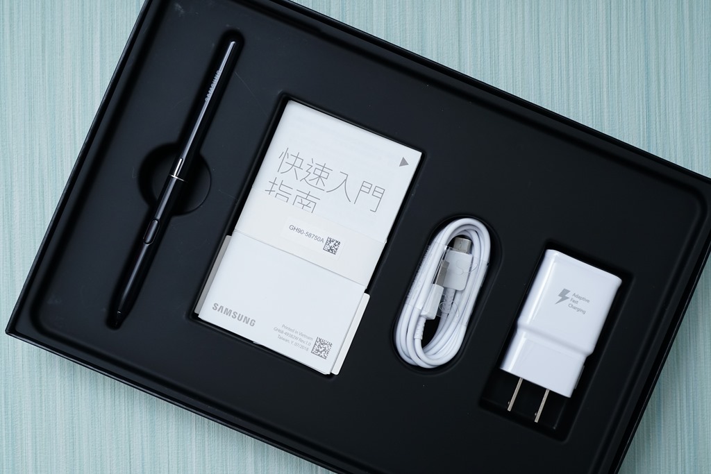 盒裝內有 Samsung Galaxy Tab S4 平板一台、充電器、Type-C 充電線、S Pen 以及 S Pen 的替換筆芯。