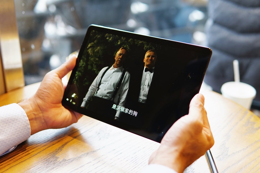 在提升觀影體驗中,很重要的一環就是音效,對此 Samsung 在 Galaxy Tab S4 中加入四組 AKG 調校的喇叭,不只音量提升,聲音的震撼度和細膩度也非常出色,加上導入杜比環繞音效(Dolby Atmos),可以在掌中的平板就欣賞到彷彿電影院般的環繞音效,在看動作片時特別能感受到環繞音效的強大,可以非常清楚的聽到劇情中追逐的車聲從哪個方向來,腳步聲、槍聲從哪個方向而去,劇中人的對白彷彿是在耳邊細語般的清晰,試過之後真的回不去用一般平板看電影,效果非常優異。