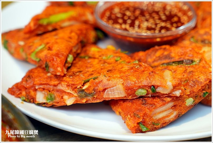 ▼泡菜煎餅,看起來紅通通的非常厲害啊!中間還有搭配特製醬料,沾附享用更對味!
