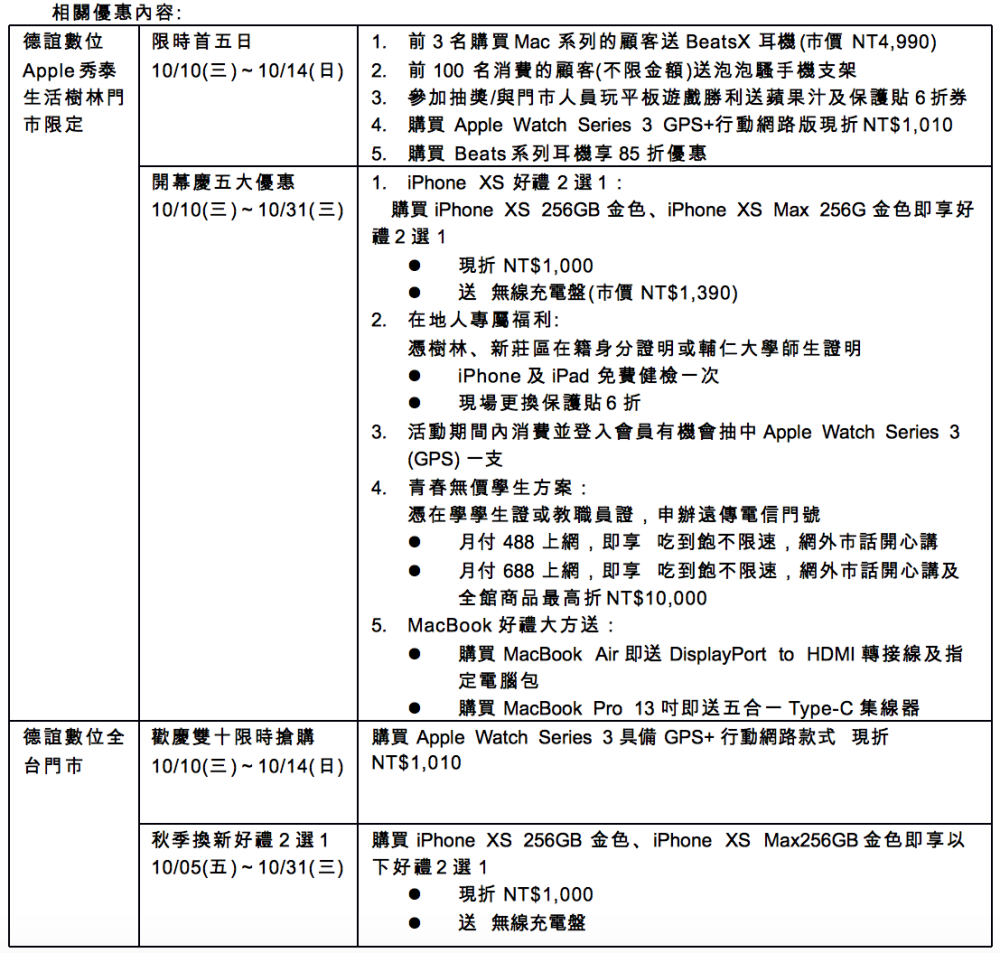 除了慶祝新門市開幕外,德誼數位為歡慶台灣雙十國慶日,更加碼推出十月Apple Watch優惠,至10月14日止,於全台德誼數位門市購買Apple Watch Series 3具備GPS+行動網路版系列現折NT$1,010元。10月入秋之際,德誼數位也推出「秋季換新 消費狂歡」優惠,購買iPhone XS 256G 金色、iPhone XS Max 256G 金色即享現折1,000元優惠或送指定款無線充電盤,10月好禮折扣提供消費者全方位的好康、切莫錯過。