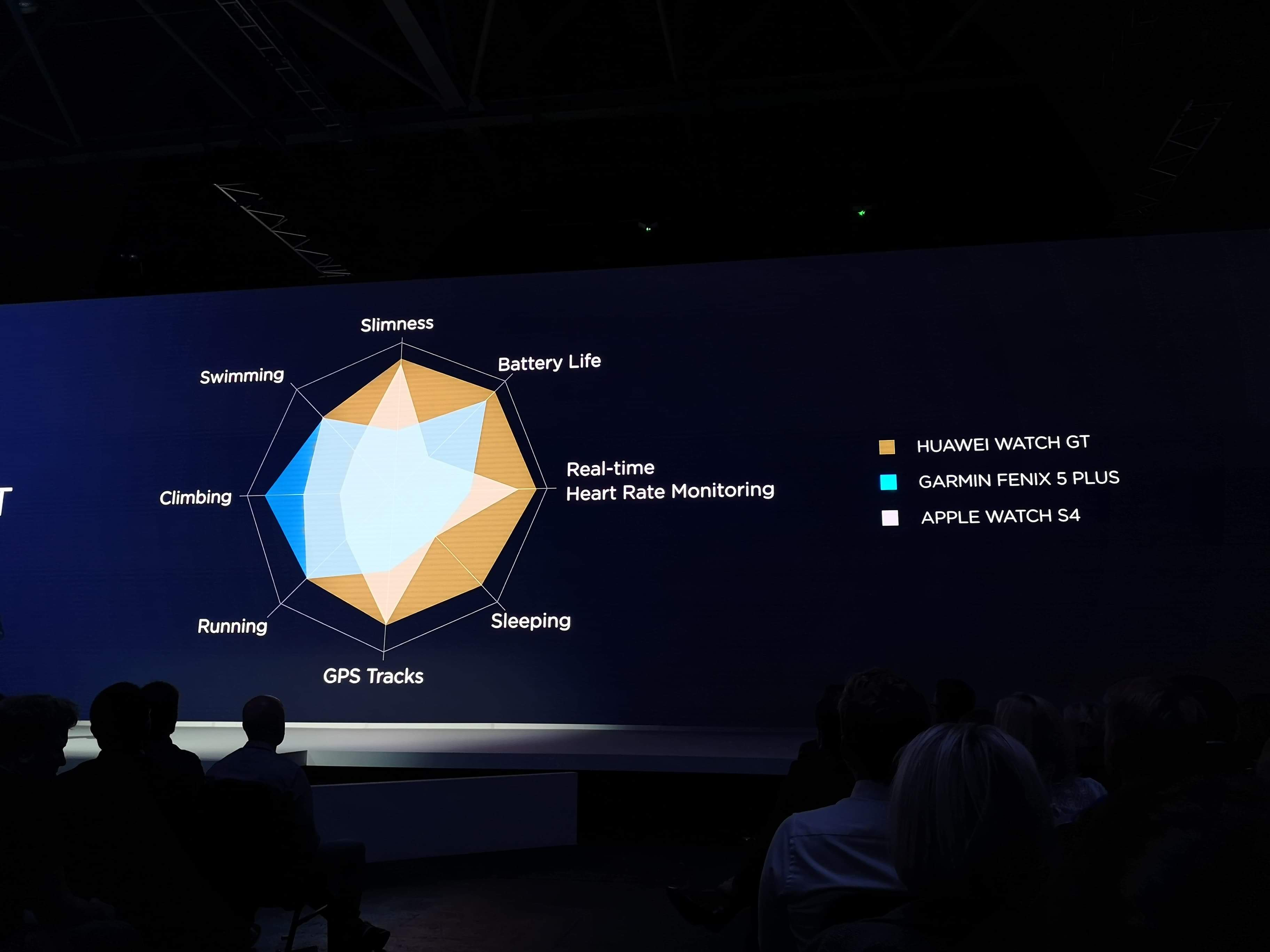 Watch GT 棄用 Wear OS,改搭載華為自行開發的 Lite OS,內建雙晶片結構設計(Dual-Chip Aechitecture),一個晶片負責動態任務,另一個晶片則替手錶省下 80% 的電量,華為以蘋果與 Garmin 的手錶做比較,Watch GT 在 GPS 模式下長達 22 小時續航,遠高於另外兩者的續航時間,一般使用下,則長達 14 天。當你關掉心率、GPS 功能,Watch GT 最高續航力達到驚人的 30 天,這一切都要歸功於 AI 演算搭配處理器的相輔相成。