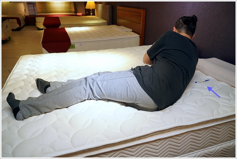 ▼沒想到大口在不知情的狀況下躺下去竟然完全沒有察覺到異物感,甚至不知道身後藏有一支筆XD可見他們的床墊可以均勻分散壓力這點準沒錯!不過大家可不要淘氣的自行在家做實驗啊(笑)~這張床原本以為很貴,但沒想到才三萬出頭,CP值也太高了!