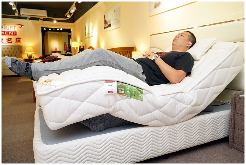 ▼大口試躺的這張是比較屬於中Q的柔系列,表布還有微微的涼感,很適合怕熱的大口!而且角度很符合身體工學,躺起來腰部也相當放鬆~如果擔心每次調的角度有誤差的話也可以利用記憶功能設定喜愛的角度,只要輕輕一按就會來到你最習慣的角度唷!如果像是女孩兒睡覺前都需要抬個腿,那電動床絕對是很適合,只要輕鬆將腿部升起即可,就不用辛苦的墊枕頭或是靠在床頭牆壁上也能達到效果啦!