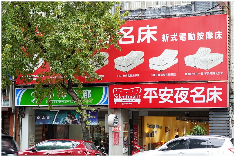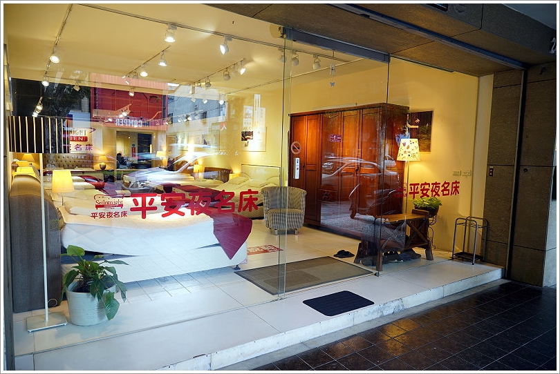 ▼「平安夜名床」中山直營門市就位於台北士林中山北路六段上,大紅色的扛棒看起來喜氣又顯眼;從招牌上可以看出他們家是以新式電動床為主打,也有提供一般的床墊,可以一次滿足不同族群的所有需求!