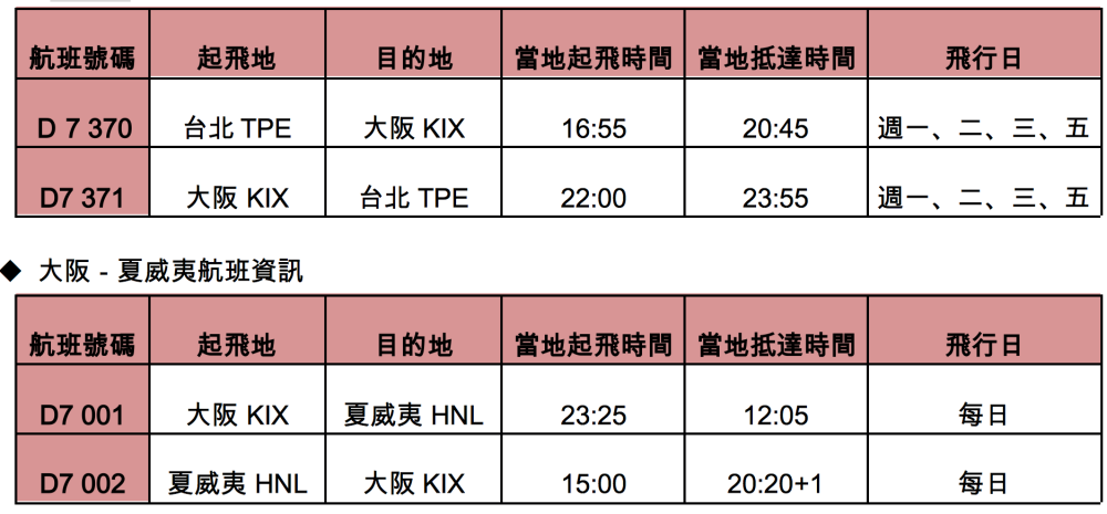 AirAsia目前共有8條從台灣出發的直飛航班,分別為台北/高雄-吉隆坡、台北-沙巴、台北-馬尼拉、台北-宿霧;今年甫開航的台北-克拉克及台北-清邁航線,以及明天即將開航的高雄-馬尼拉,而台北-大阪航線不僅是台灣出發的第9條直飛國際航線,更是AirAsia近年來由台灣直飛東北亞的首條航線。明(30)日中午12點即將以首賣震撼價單程未稅新台幣1,388元起,豪華平躺座位單程未税新台幣3,388元起,搶攻日本市場,首航預計於2019年1月30日16:55台北起飛,此次開賣可購買出發日期為2019年1月30日至2019年3月30日的航班,之後班表仍待相關單位核准。