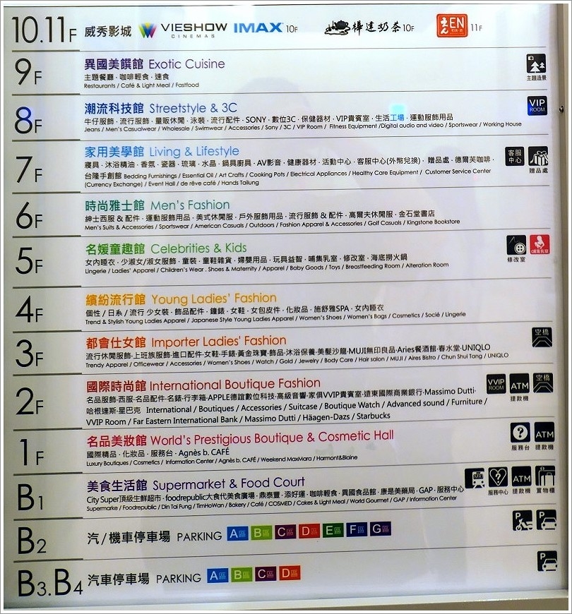 ▼樓層簡介,主要餐廳與美食大部份都分佈在B1跟9樓,其他像是10樓、11樓及其他樓層也有一些餐飲品牌,先提供給大家參考一下!
