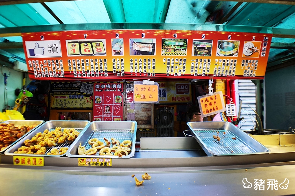 這家鹹酥雞的商品比較不太一樣,連深海大魷魚、牛蒡天婦羅、各類肉串都出現在架上,第一次來可能不知道有獨家爆料雞排,因為客人通常都是直接走到攤子上動手夾食材很少會仔細看菜單,還好我有先做功課,網友分享許多隱藏版菜單,像是起司蟹肉棒雞排、三星蔥干貝雞排、鳳梨鮮蝦雞排、還有韓式泡菜、青蔥干貝蝦仁、蛤蠣絲瓜等創意餡料的爆料雞排,還有出過甜鹹口味oreo雞排!