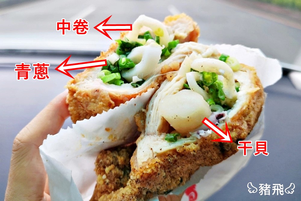 ▲光是這個爆料畫面就令人尖叫連連!這是我看過最多料的雞排,把明太子起司、三星蔥干貝中卷包進雞排裡,創意十足!