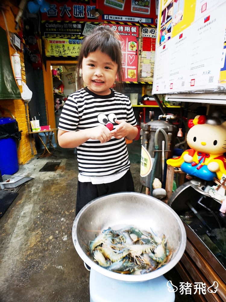 攤位旁邊有一個小小魚缸,裡面養了小魚跟泰國蝦,實在是太好奇了怎麼會有泰國蝦啦?然後可愛的小妹妹就從家裡端了一盆泰國蝦出來給我拍照,小妹妹是這攤子小小老闆喔,我說可以把蝦子放進去炸一炸請客人吃啊,他緊張的說這是爸爸朋友送的只能看不能吃,哈哈哈。