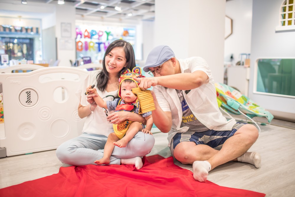 如果要以場合而言,比較輕鬆的狀態下,像是溫溫的抓周派對時,熊則是挑了淺藍色的帽子搭配白襯衫