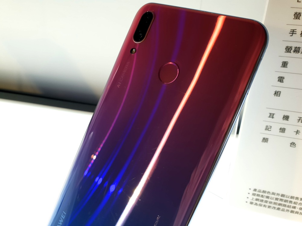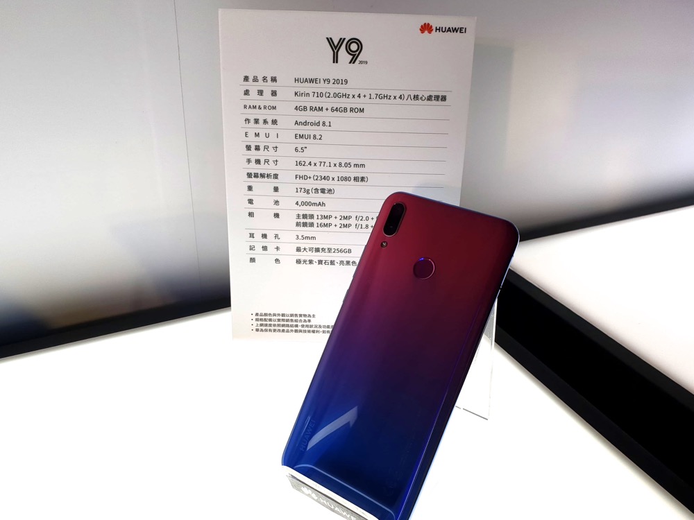 Y9 2019 版規格上為 6.5 吋 FHD+ 2340 x 1080 解析度螢幕、Kirin 710 八核心處理器、4GB + 64GB 組合、主鏡頭為 13MP + 2MP 、前置鏡頭為 16MP + 2MP、4,000mAh 電池容量。