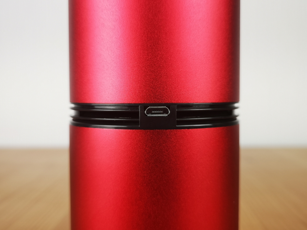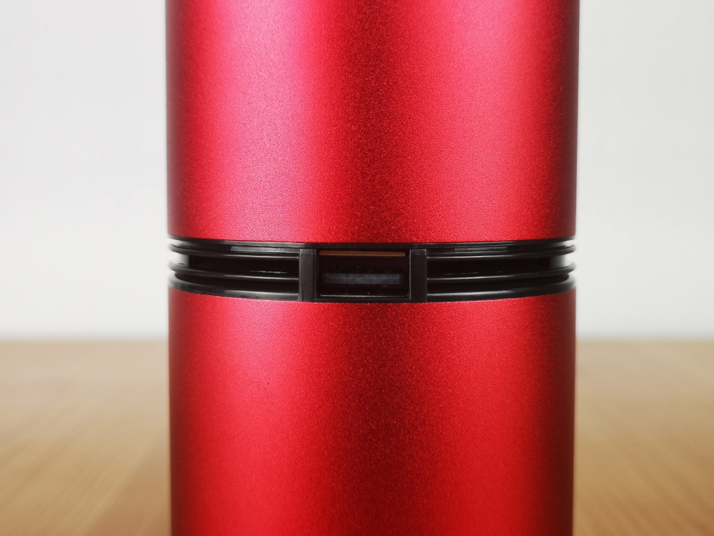 機身採用 1.2mm 高硬度鋁合金外殼打造, 沒有看似廉價塑膠感,抓握上也不容易留下髒污在機身上。取車充頭當比例,150mm 高度還不及一罐瓶裝水,直徑也僅比 350ml 鋁罐飲料罐寬一點點而已。