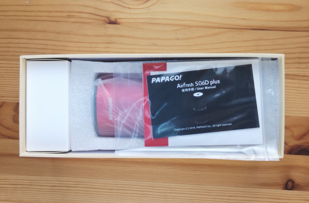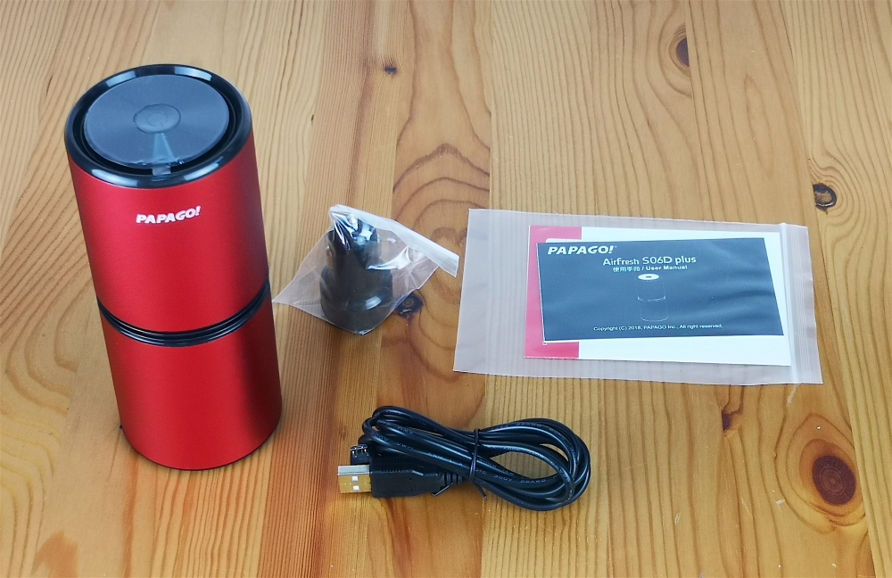 PAPAGO! Airfresh S06D Plus 空氣清淨機內盒標準配備有:Airfresh S06D plus主機、USB電源線(1.5M)、雙孔車充頭(2.4A)、說明書、保固卡。