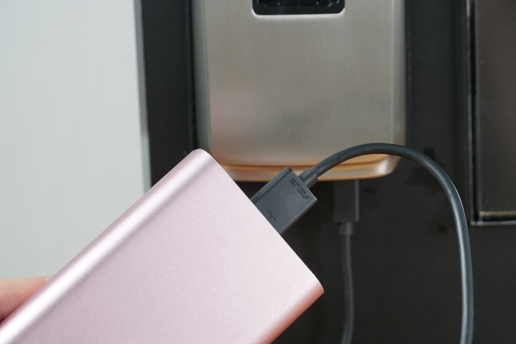 在外門下方鑰匙孔旁,有個 microUSB 孔,只要你手上有行動電源,就可以幫門充電,此時就可以開門了,門打開後還是要記得先更換電池,不然真的會被鎖在門外了。