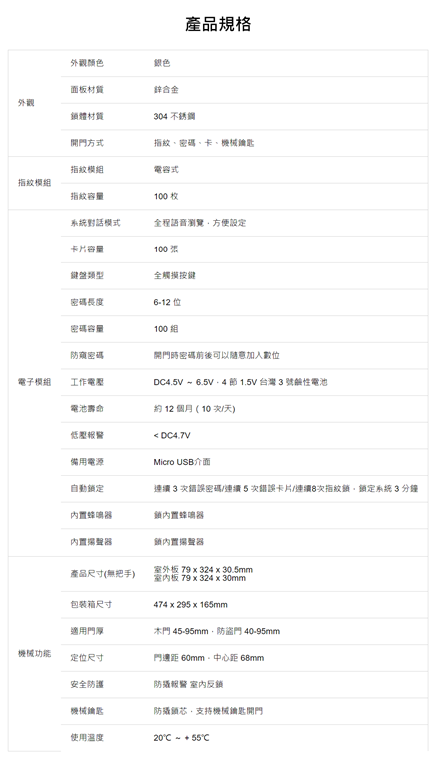 最後分享產品規格給大家,這款產品購買時會採用免費預約安裝的方式,如果評估後家中無法安裝,是可以免費退費的,如果對產品還有更多問題,可以直接參考他們官網(http://tw.papagoinc.com/Products/SmartLock/AL8100.aspx?pid=109)說明。