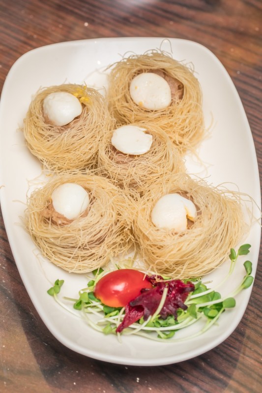 接下來這款,則是有著華麗外型的葡汁鵲巢蛋(220元,每份三個),外層有鬆脆的脆麵線,裡面則是香濃不膩口,這道算是比較有口感特色的點心,也是熱愛咀嚼感朋友的最愛。