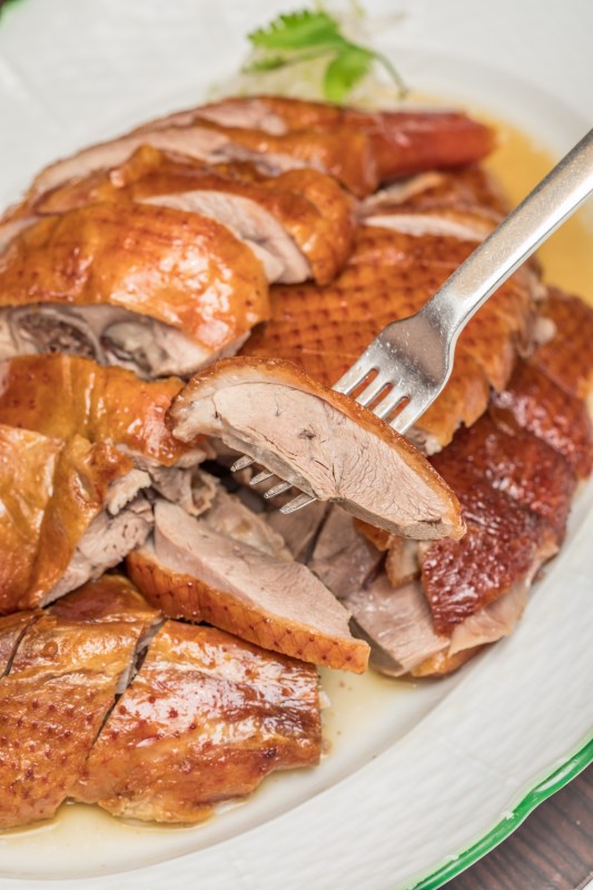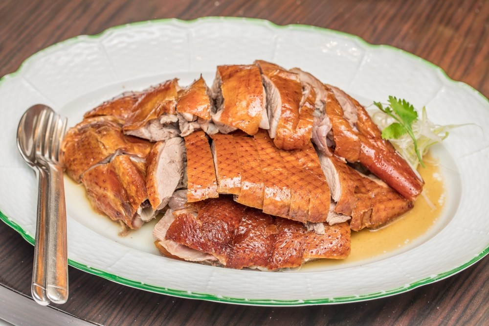 品嚐了清爽的湯品,再來一連串上桌的,就是濃郁重口味的大菜,包括這道看起來就非常多汁逼人的掛爐廣烤鵝切盤。(1800元,半隻)