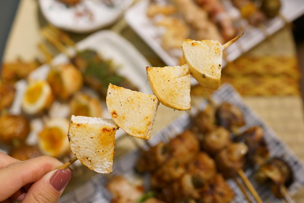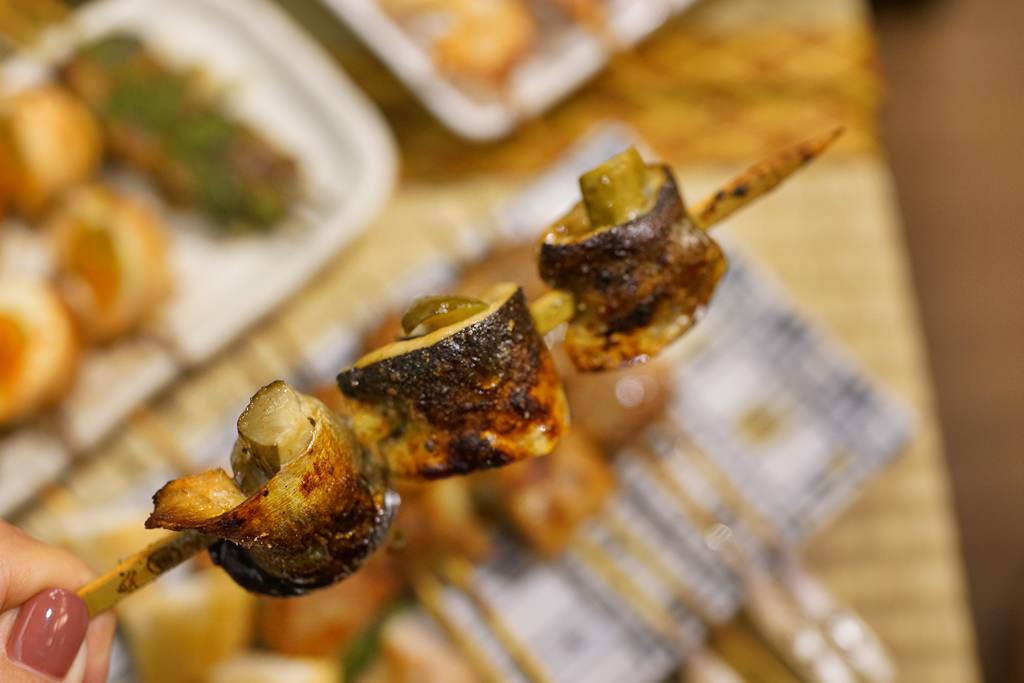 除了肉串,燃手串也有非常多的蔬菜可以選擇,像是基本的杏鮑菇、筊白筍、香菇、洋蔥,還有櫛瓜唷!日本山藥的口感特別厚實,沒有過多調味,可以吃出山藥自然的甜味。