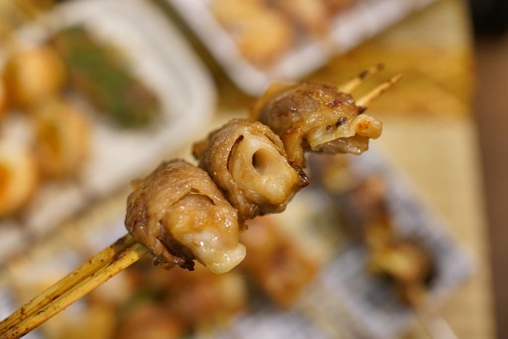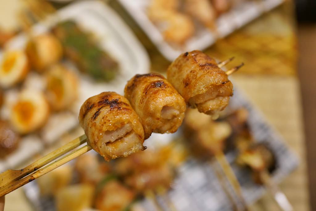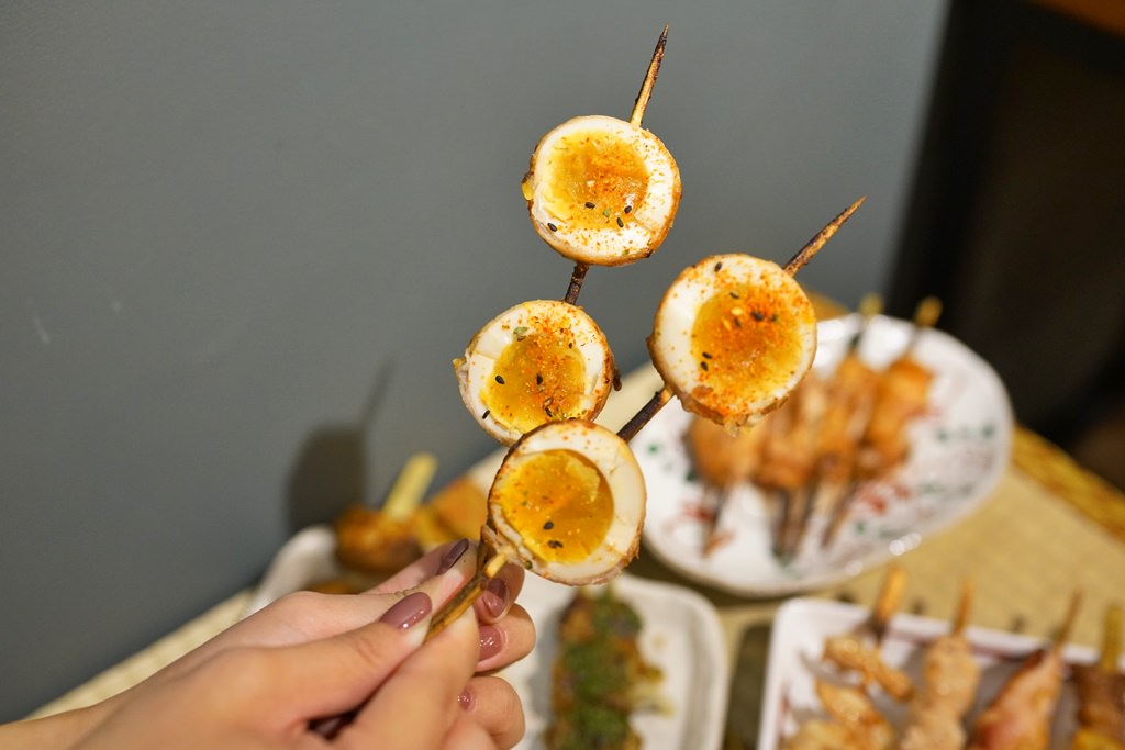 一串是兩大顆溏心蛋,外面裹了一層薄薄的豬肉片,相當特別,除了可以吃到溏心蛋的Q彈口感,還有外層的焦香味,這個好吃必點!