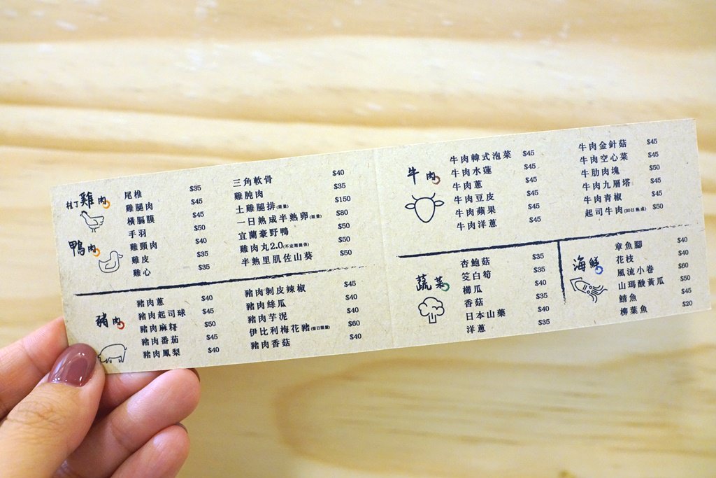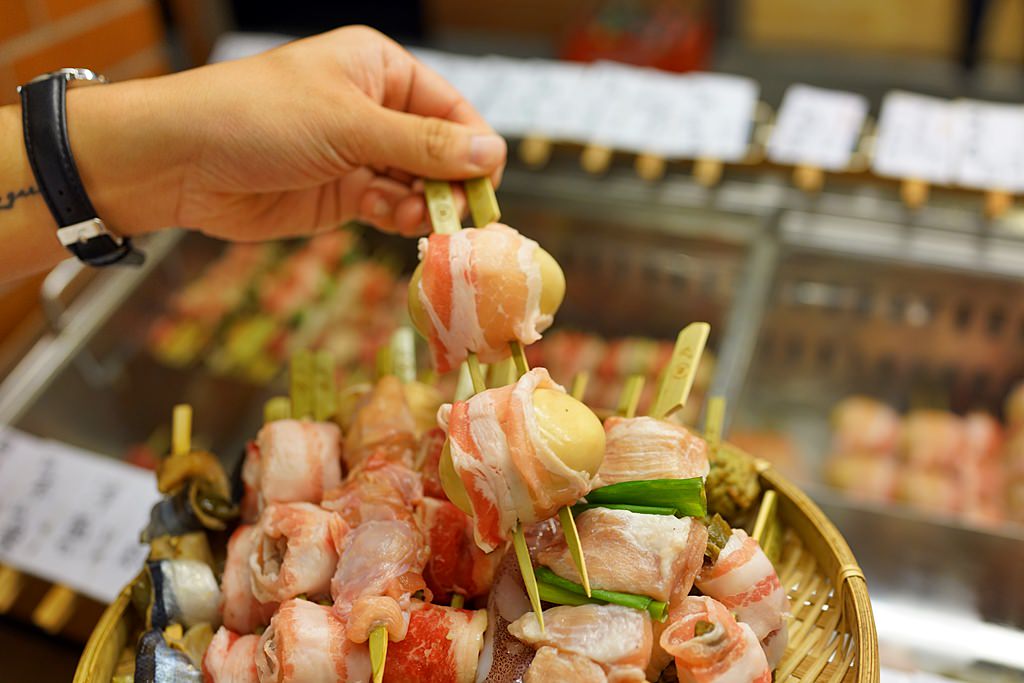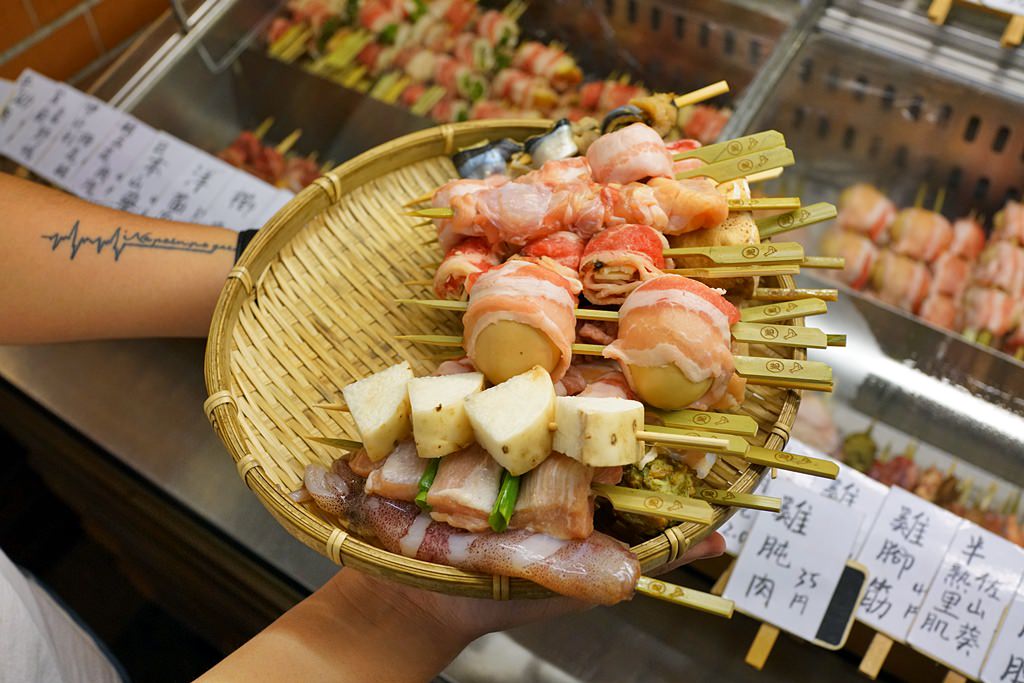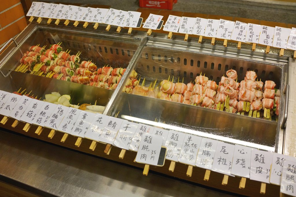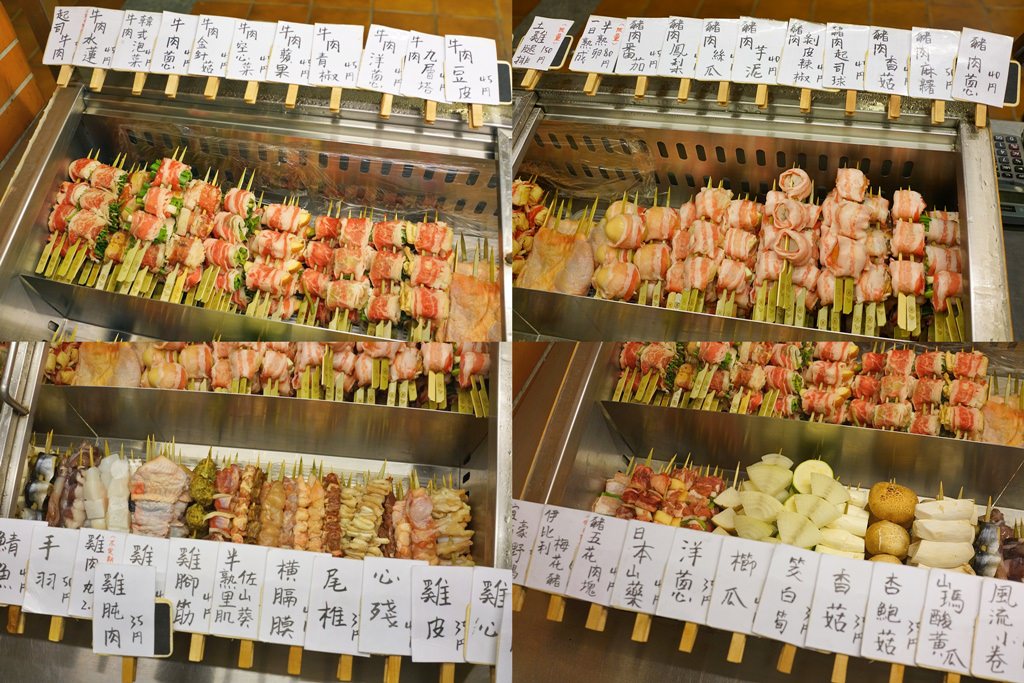 攤車上擺放著琳瑯滿目的串燒,大致分成牛肉類、豬肉類、雞肉類、蔬菜類等,種類蠻多、每個種類又再細分,仔細一看會發現好多從未看過的口味呢!採自取的方式,挑選好之後結帳即可,內用直接入座等候即可,也可外帶唷!