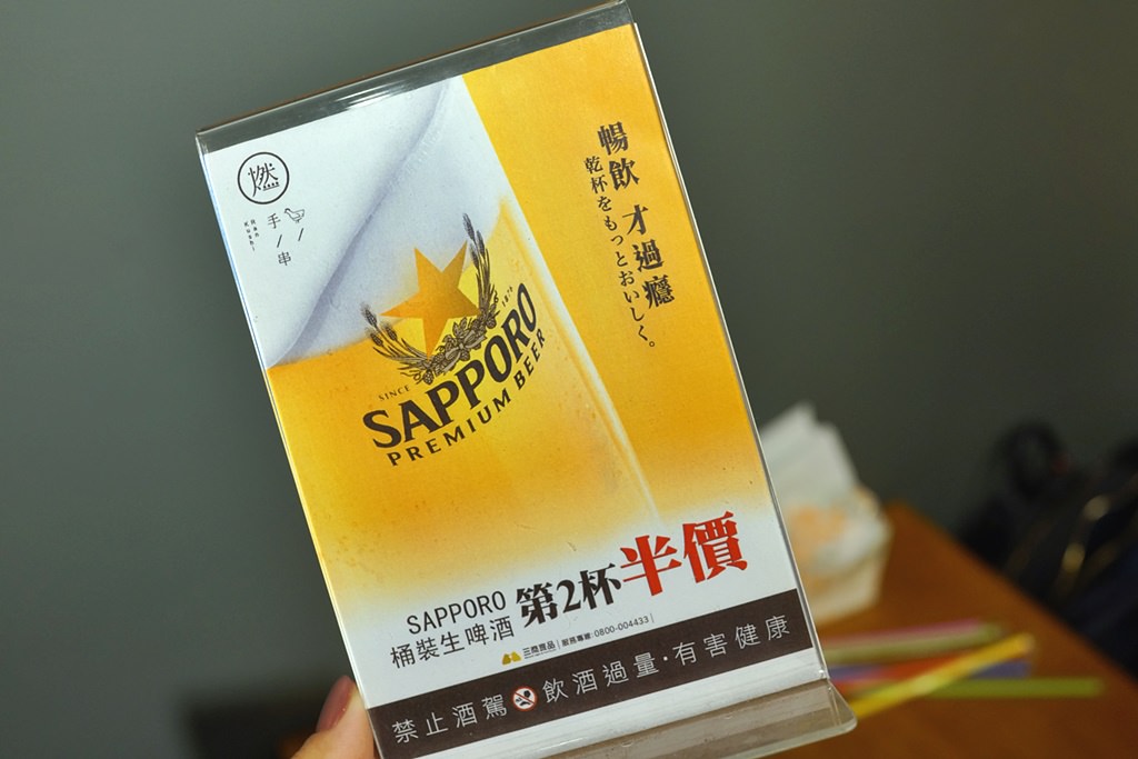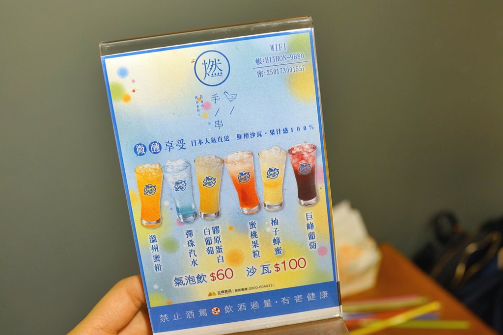 吃串燒當然不可能只配湯嘛,總是要喝點飲料之類的,燃手串提供多達六種口味的氣泡飲、沙瓦以及桶裝生啤酒(喝酒不開車、開車不喝酒、未成年請勿飲酒)如果不喝酒,也有碳酸飲料、果汁、檸檬茶等選擇。