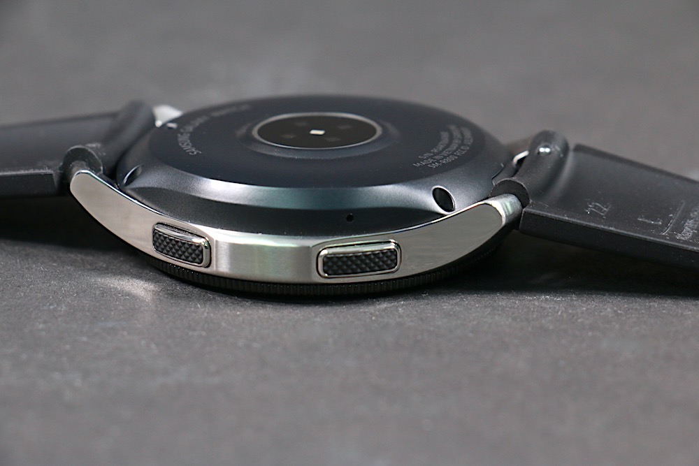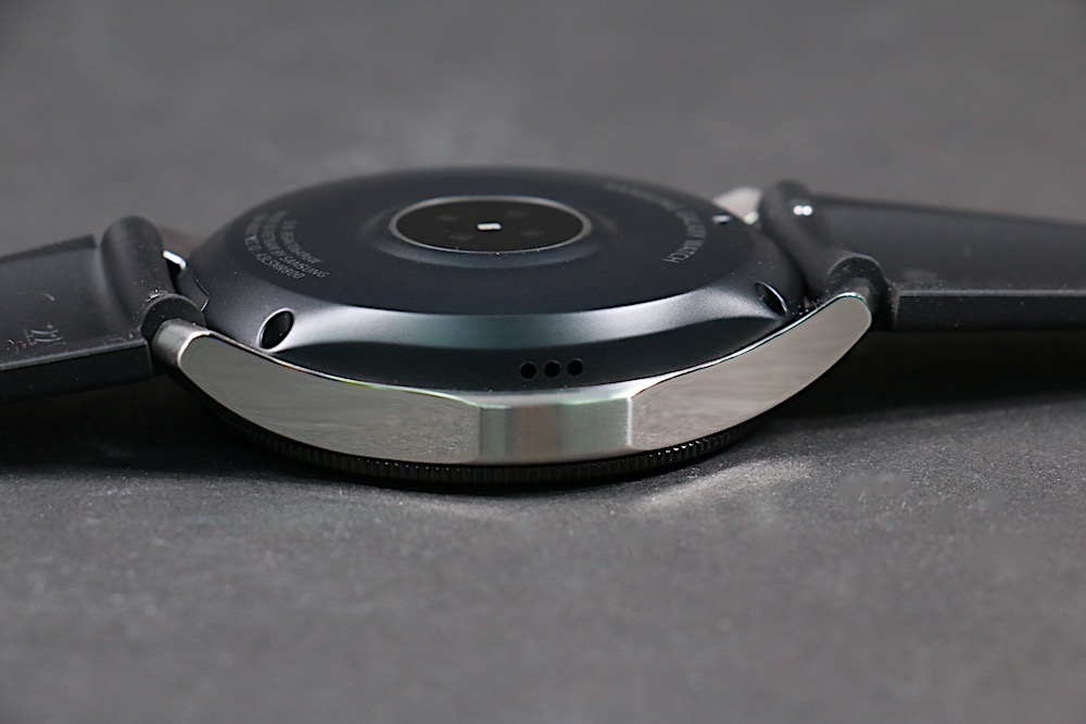 在右側兩個按鍵的後方,設置了一個麥克風,除了可以使用它通話之外,也可以透過它來喚起 Bixby 語音助理,並說出想要 Bixby 協助的事項。另外,必須注意的是,由於麥克風的位置較接近手腕,使用時務必注意不要讓手腕遮住了麥克風,以免影響收音效果。